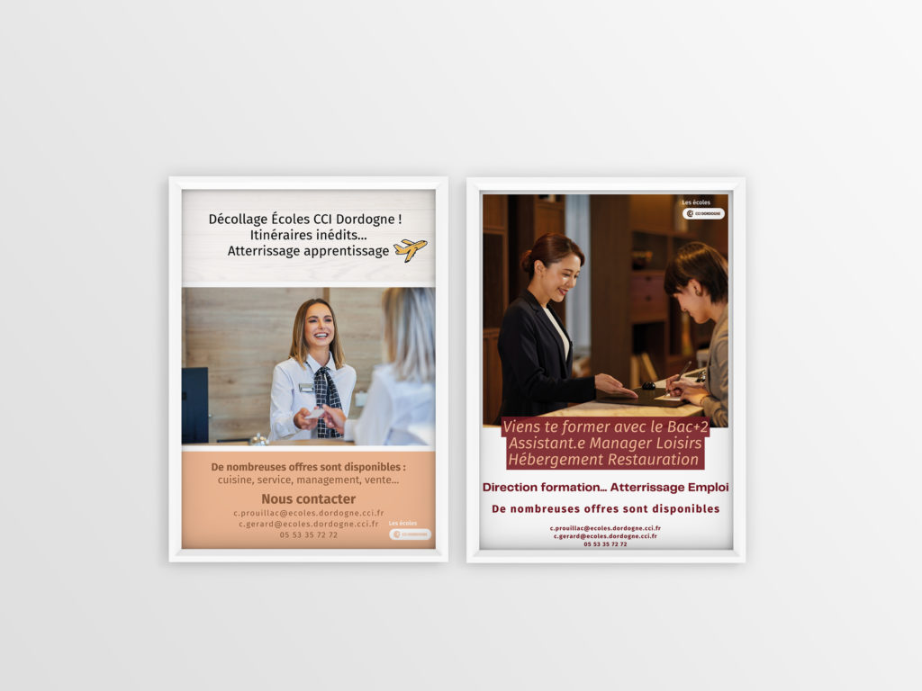 Conception et réalisation de cinq affiches pour promouvoir différentes formations des Écoles de la CCI Dordogne.